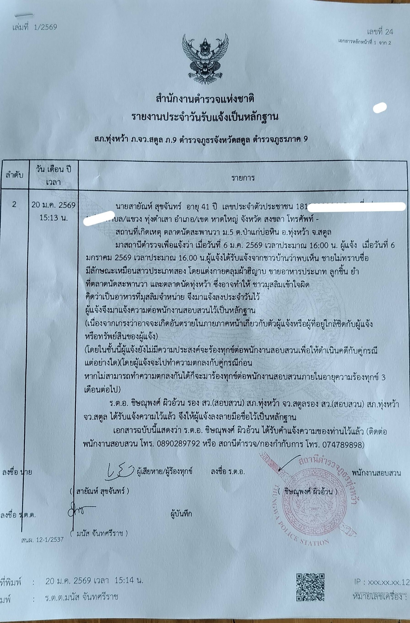 ก่อนหน้านี้ เมื่อวันที่ 20 มกราคม 2569 ประธานศูนย์พิทักษ์ธรรมและคณะทำงาน ได้เดินทางไปแจ้งความบันทึกประจำวันไว้เป็นหลักฐาน ณ สถานีตำรวจภูธรอำเภอทุ่งหว้า โดยไม่ได้มีการประสานขอความร่วมมือจากเจ้าหน้าที่ตำรวจเพื่อเข้าตรวจสอบพื้นที่ในขณะนั้น